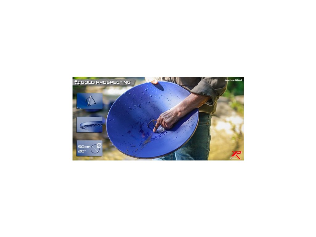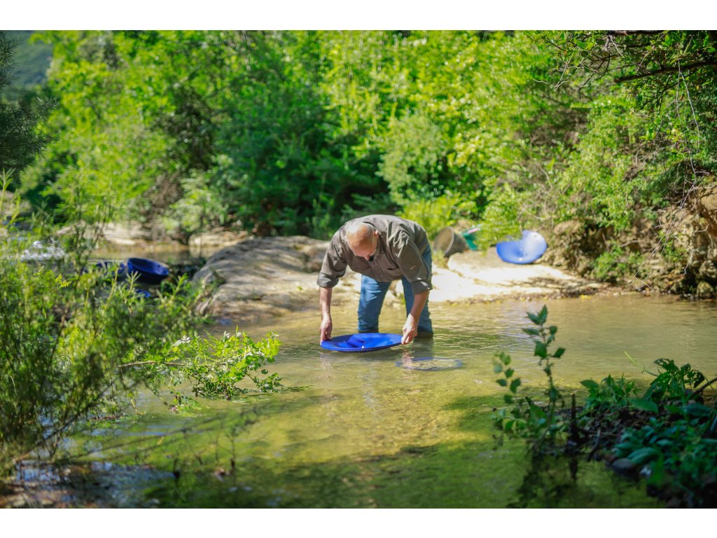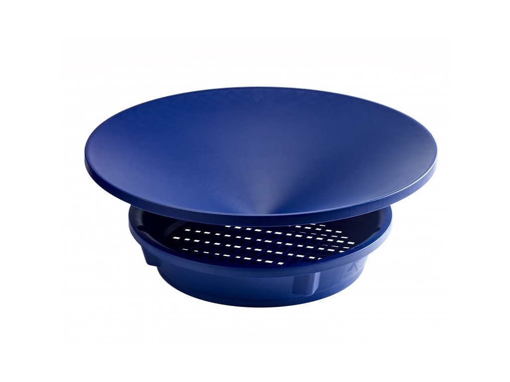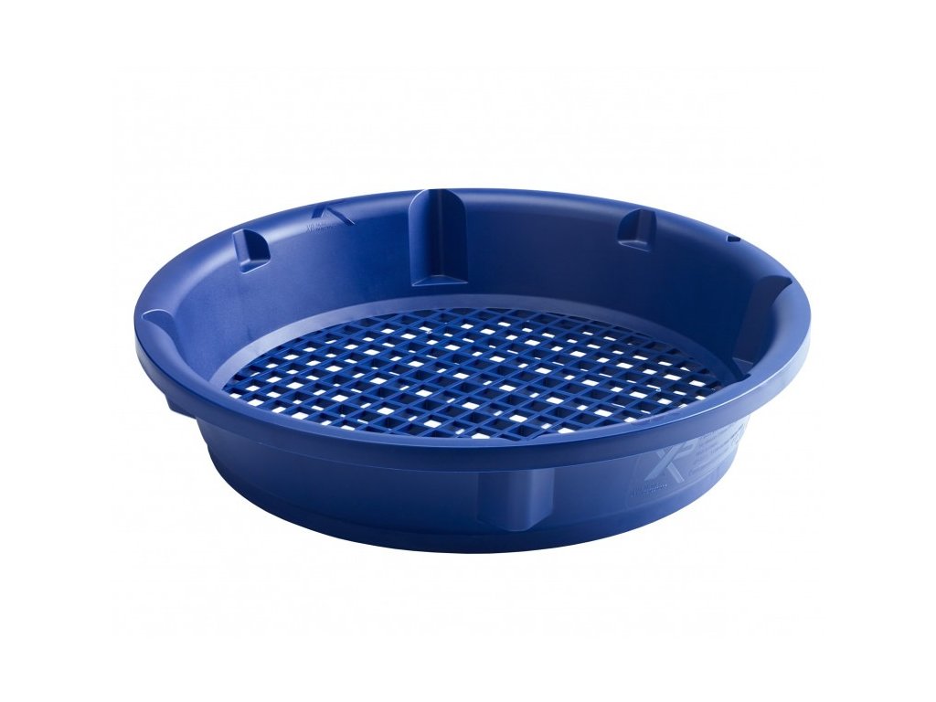 Prvým krokom je samozrejme použitie kátrovacích sít. Sitá môžete použiť jednotlivo alebo súčasne. Presne do seba zapadnúť a skvelé tiež sedí na panvici. Prvé sito má otvory o veľkosti 10 x 10 mm a druhé o veľkosti 5 x 5 mm. Veľmi rýchlo a efektívne sa zbavíte väčšej frakcie a do panvice prepadne drobná frakcia, ktorú potom ľahko preryžujete. Modrá farba panvíc bola zvolená pre optimálny kontrast so zlatom. Je na panviciach naozaj skvele vidieť.