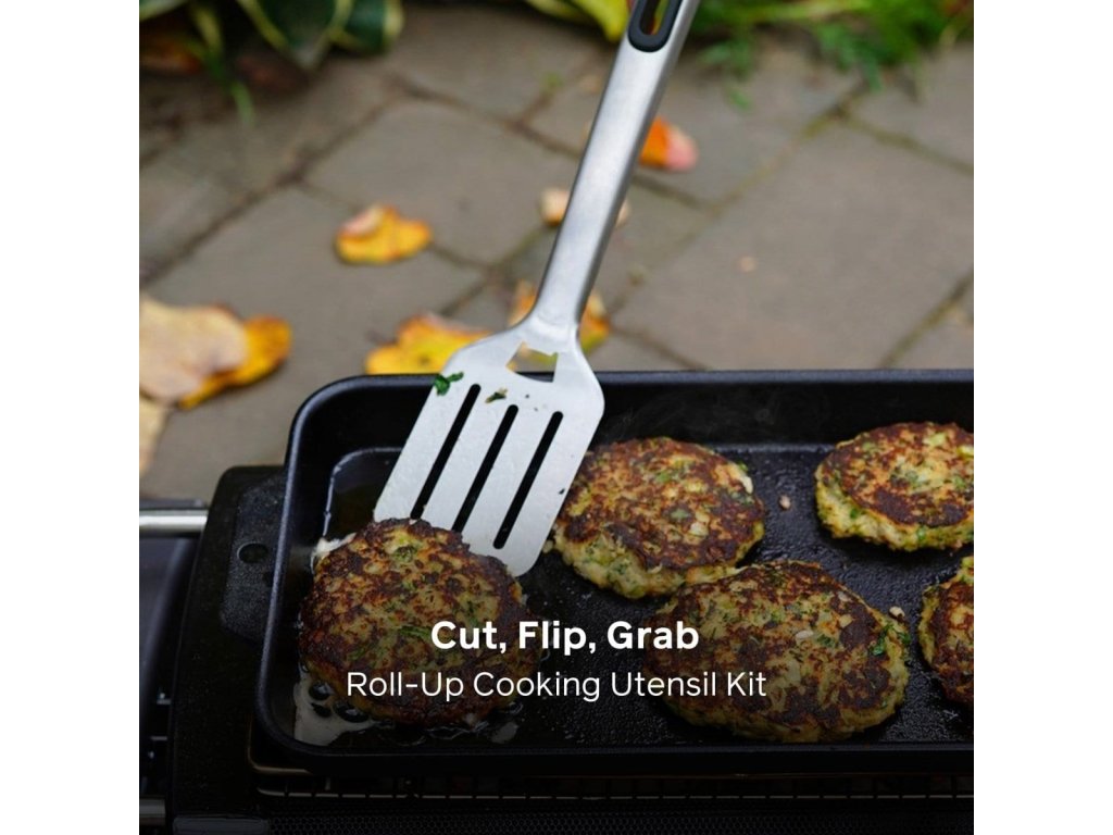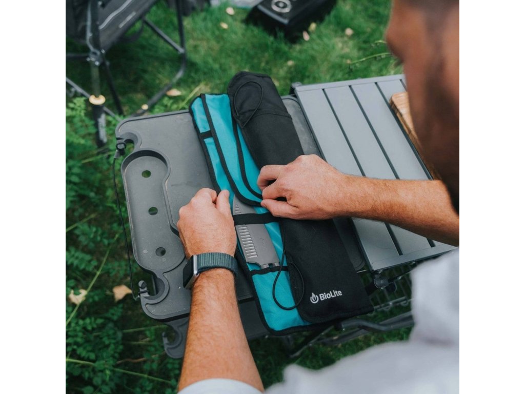 Zbaliteľné nástroje určené na varenie s ohňom. Extra dlhý dizajn poskytuje pohodlnú vzdialenosť od plameňov a tepla, zatiaľ čo rolovacia organizačná podložka udržuje všetko v poriadku. Vyrobené z trvanlivej a nehrdzavejúcej potravinárskej nehrdzavejúcej ocele. Používajte s BioLite FirePit, BioLite CampStove alebo s varením vonku podľa vlastného výberu.