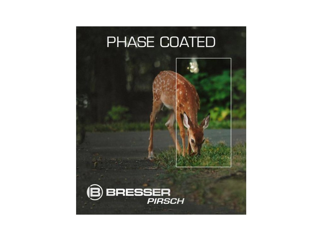 Ďalekohľad Bresser Pirsch 8x42 Phase Coating je prémiový binokulár so strechovými hranolmi, 42mm objektívmi a 8-násobným zväčšením. Ďalekohľad s excelentnými optickými aj mechanickými vlastnosťami je vhodný nielen pre poľovníkov, ale aj ako ďalekohľad na turistiku a cestovanie aj za nepriaznivých svetelných a poveternostných podmienok. Binokulár Pirsch vyniká najnovšou technológiou fázového antireflexného vrstvenia, ktorá prináša nezvyčajne kontrastný obraz s vysokým rozlíšením. Vďaka použitému optickému sklu BaK-4 vykazuje veľmi čistý a jasný obraz. Zorné pole viditeľnosti ďalekohľadu je 125m na 1km (7,14°), zaostriť je možné už od 2m. Zaostrovanie je stredové s dioptrickou korekciou (pravý okulár). Vysúvacie očnice umožňujú nastaviť aj pozorovateľom s okuliarmi optimálnu vzdialenosť výstupnej pupily a vidieť plné zorné pole aj pri pohodlnej vzdialenosti oka od šošovky okulára. Telo ďalekohľadu je pogumované a odľahčené, bez stredového mostíka pre pohodlný a pevný úchop. Binokulár sa dodáva s kvalitným širokým a mäkkým popruhom pre prijemnejšie zavesenie ďalekohľadu na krk. Ďalekohľady Bresser Pirsch sú vodotesné a plnené dusíkom proti vnútornému zahmlievaniu.