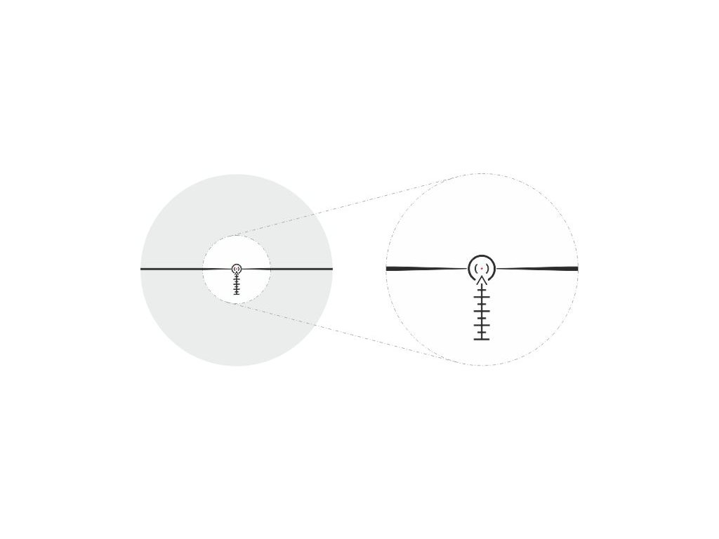 Záměrná osnova se světelným bodem Kříž zaměřovače Jaeger je umístěn ve druhé (zadní) ohniskové rovině a tak nedochází ke změně velikosti kříže a tím i zbytečně velkému zakrytí křížem cíle při větších zvětšeních. Pro lepší zaměření kříž má v centru světelný bod, jehož regulace jasu má široký rozsah intenzit tak, aby pokryla běžné světelné podmínky použití puškohledu. Pro rychlé zapnutí nebo výpnutí bodu ovladáč má mezipolohy se stavem „vypnuto". |