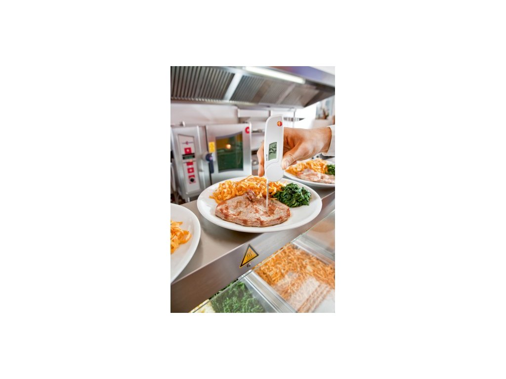 Sklápací teplomer testo 103 meria teplotu potravín presne a kedykoľvek je to potrebné - pri výrobe, skladovaní a spracovaní, v gastronómii, v supermarketoch, v potravinárskom obore alebo v oblasti priemyslu. Teplomer testo 103 meria už od uhlu vyklopenia nad 30° a je preto flexibilne použiteľný. Po meraní je možné sondu jednoducho sklopiť a až do ďalšieho merania mať teplomer bezpečne uložený - napríklad vo vrecku nohavíc. Sklápací teplomer testo 103 zaisťuje zhodu ako s HACCP, tak aj s normou EN13485.