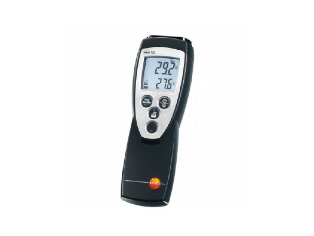 K teplomeru testo 720 je možné pripojiť sondu Pt100 alebo NTC sondu. S teplomerom testo 720 je možné merať povrchovú teplotu, ako aj teplotu vzduchu a uskutočňovať merania ponorením do média. Nepretržité zobrazovanie hodnôt Min. a Max., veľký, podsvietený displej, ľubovolne definovateľné limitné hodnoty a akustický alarm pri prekročení limitnej hodnoty doplňujú vybavenie orientované na prax.