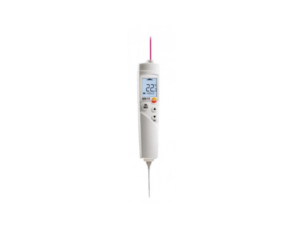 Testo 826-T4 je 2- kanálový infračervený teplomer na meranie povrchovej teploty a vpichovej teploty jadra, , ideálny pre potravinársky priemysel s 1-bodovým laserovým zameraním miesta merania.