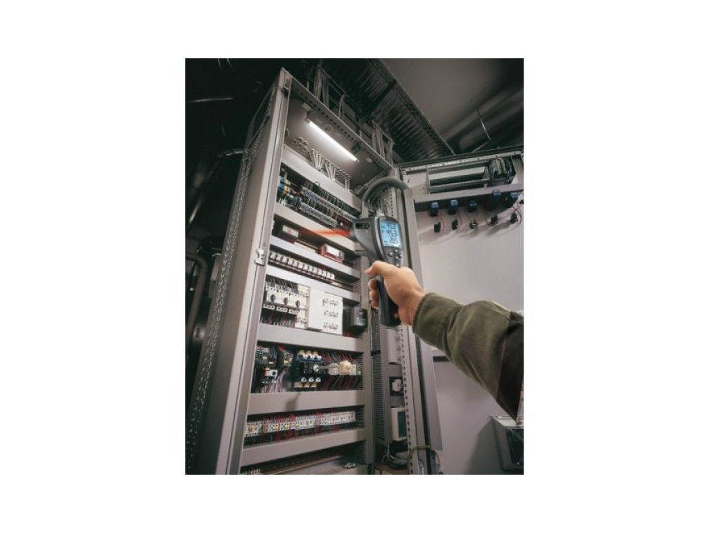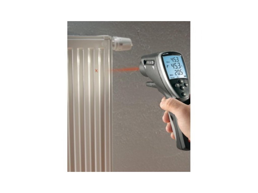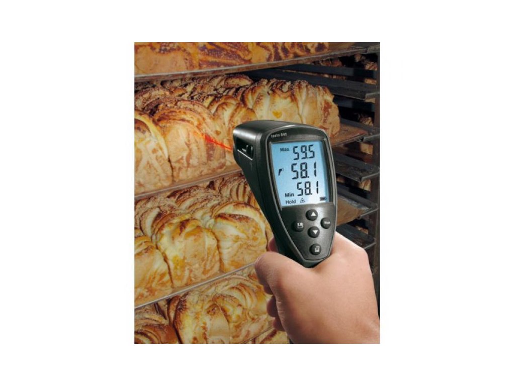 Prístroj testo 845 je kompaktný infračervený teplomer s prepínateľnou optikou „Switch“ pre bezdotykové meranie porchových teplôt. Prepínateľná optika na meranie vzdialeného poľa a meranie na krátku vzdialenosť umožňuje v oboch prípadoch presné meranie. Meranie vzdialeného poľa prebieha pritom s optickým rozlíšením 75:1. Tak je možné s veľkou presnosťou merať povrchovú teplotu aj z veľkej vzdialenosti od meraného objektu. Pri vzdialenosti 1,2 metra od meraného objektu je priemer meranej plochy len 16 mm. Miesto merania pritom presne označí laserový krížik. Pri meraní z malej vzdialenosti k meranému objektu poskytuje optika pri vzdialenosti 70 mm priemer meranej plochy s veľkosťou len 1 mm. Meranú plochu pritom označujú dva laserové body. Pomocou pripojenej sondy je možné uskutočňovať aj ďalšie merania. V prístroji môžu byť uložené individuálne hraničné hodnoty; akonáhle dôjde k prekročeniu alebo podkročeniu týchto hodnôt, rozoznie sa akustický signál a zároveň sa rozsvieti optický výstražný signál.